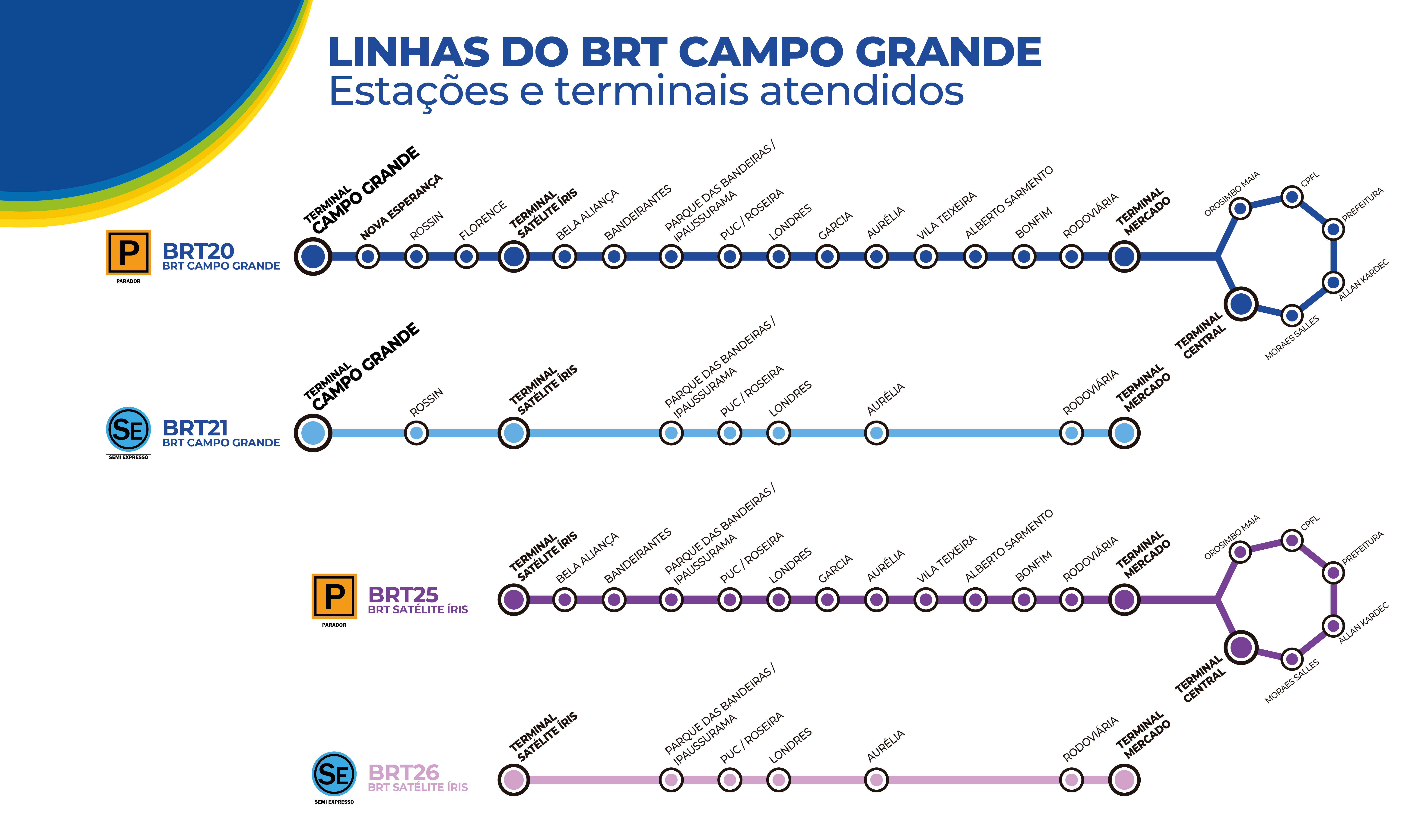 A operação BRT foi expandida gradualmente, entre novembro de 2022 e janeiro de 2024. São sete linhas em circulação (quatro no Campo Grande e três no Ouro Verde): Linhas do Corredor Campo Grande: - BRT21 (Term. Campo Grande / Term. Mercado): semiexpressa, atende a três terminais e seis estações BRT. - BRT25 (Term. Satélite Íris / Term. Mercado / Corredor Central): paradora, atende a três terminais e 11 estações BRT. - BRT26 (Term. Satélite Íris / Term.Mercado): semiexpressa, atende a dois terminais e cinco estações BRT. As paradoras funcionam diariamente. As semiexpressas, apenas nos horários de pico, em dias úteis.
