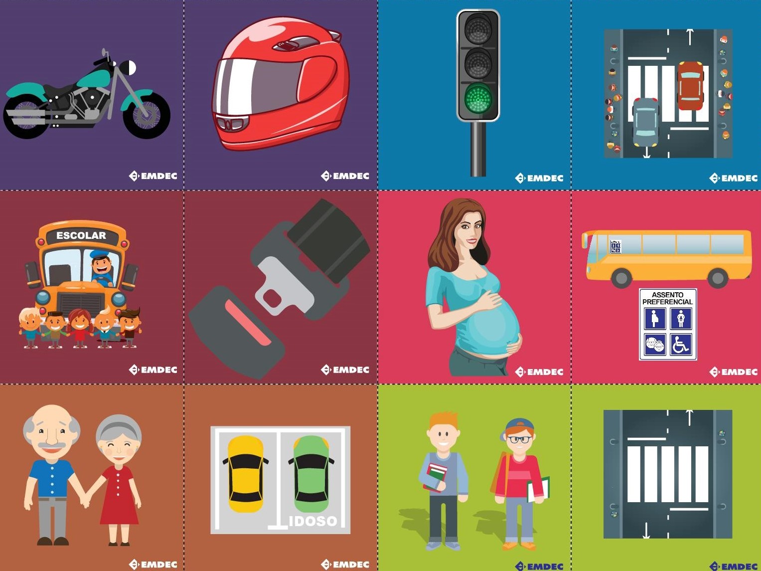 Este é um jogo de memória diferente. Em vez de encontrar as imagens iguais, as crianças devem relacionar os assuntos da mobilidade urbana: idoso com vaga exclusiva; carro com cadeirinha; moto com capacete; entre outros.