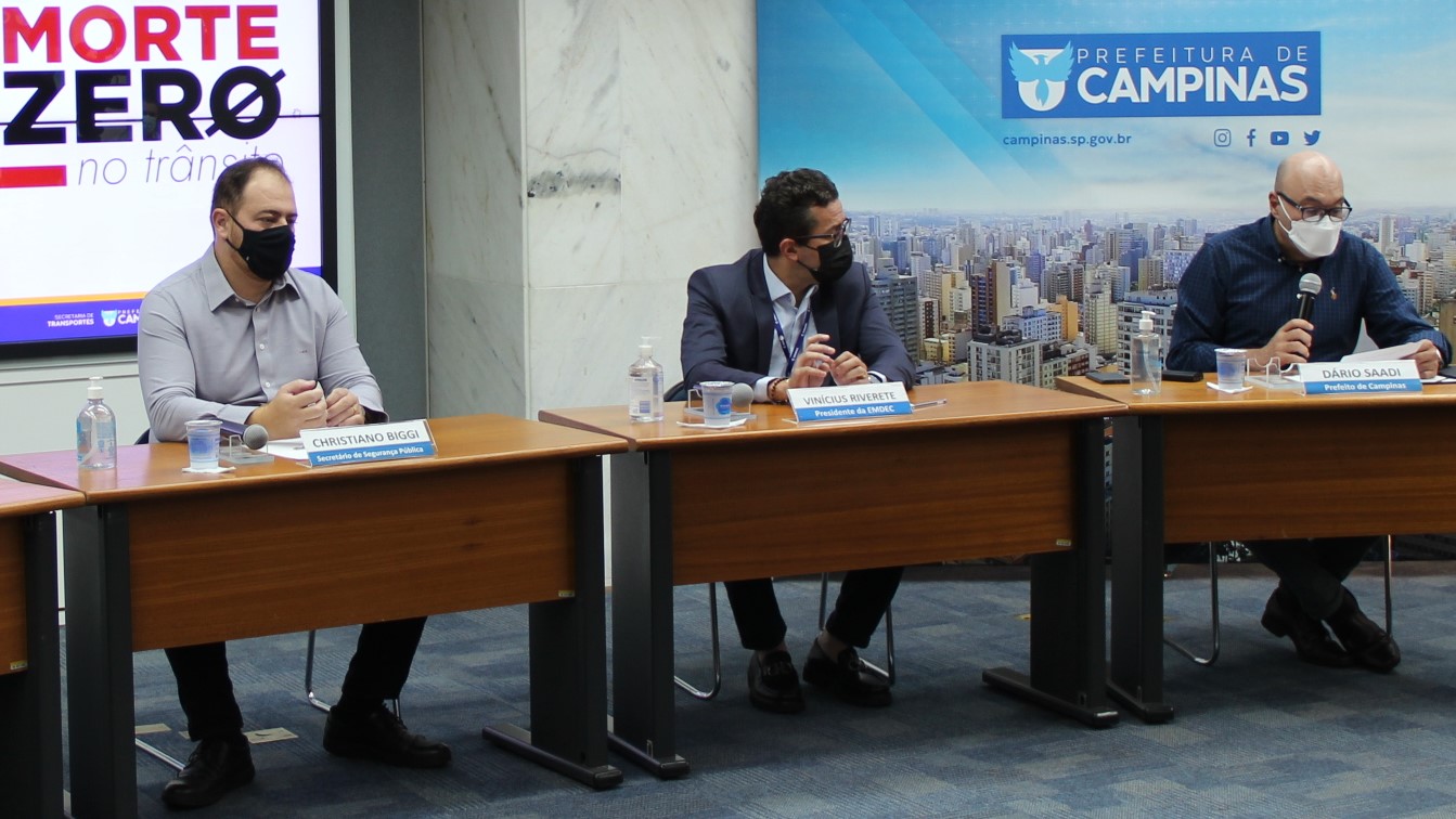 À esquerda, blitz educativa da Emdec na JBD; à direita, o lançamento da campanha, com o prefeito Dário Saadi, o presidente da Emdec, Vinicius Riverete, e o secretário de Cooperação nos Assuntos de Segurança Pública, Christiano Biggi