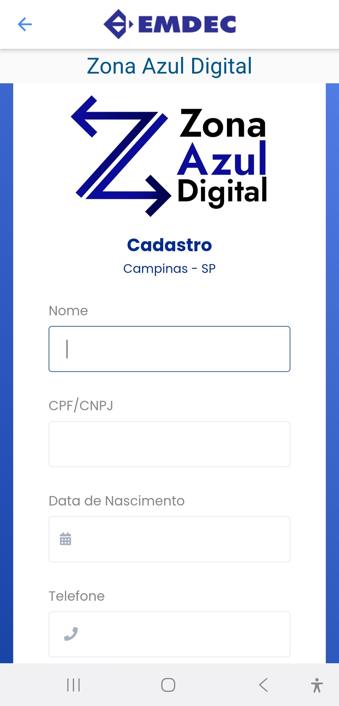 ascimento, CPF ou CNPJ, telefone e e-mail, e crie uma senha de acesso;